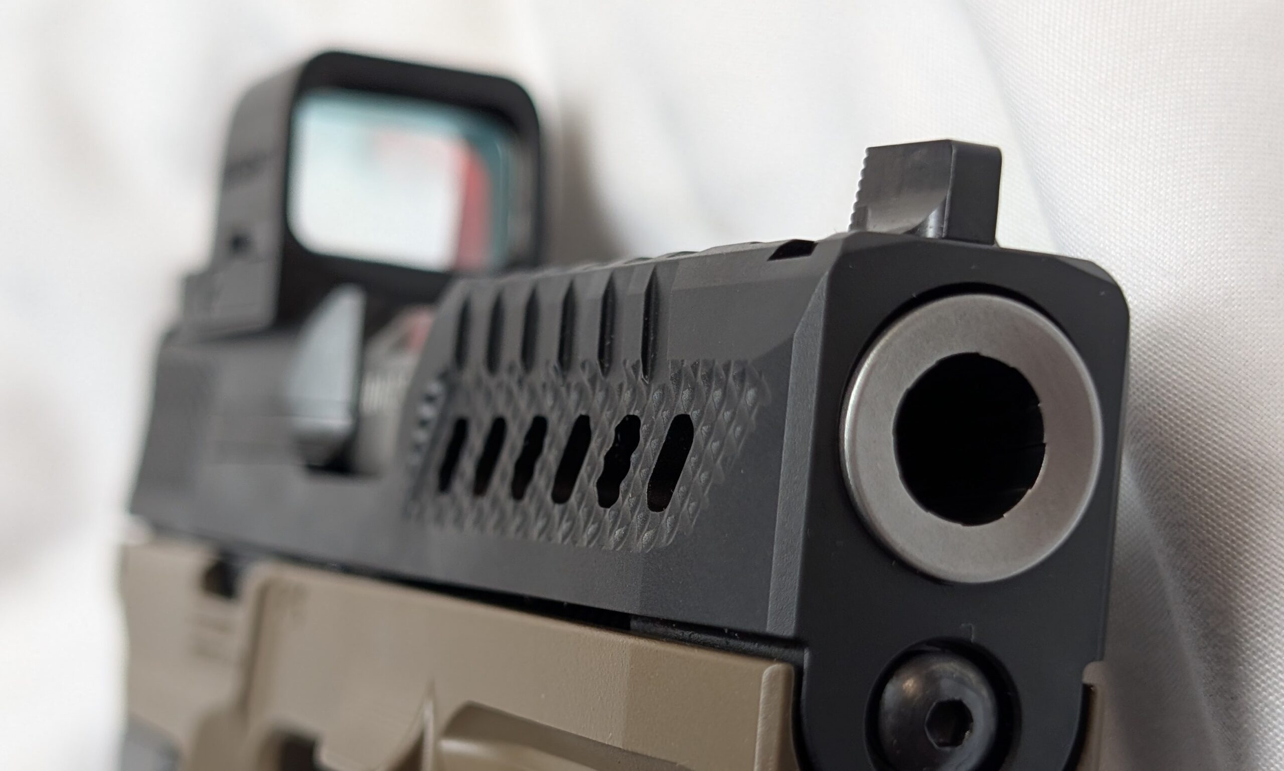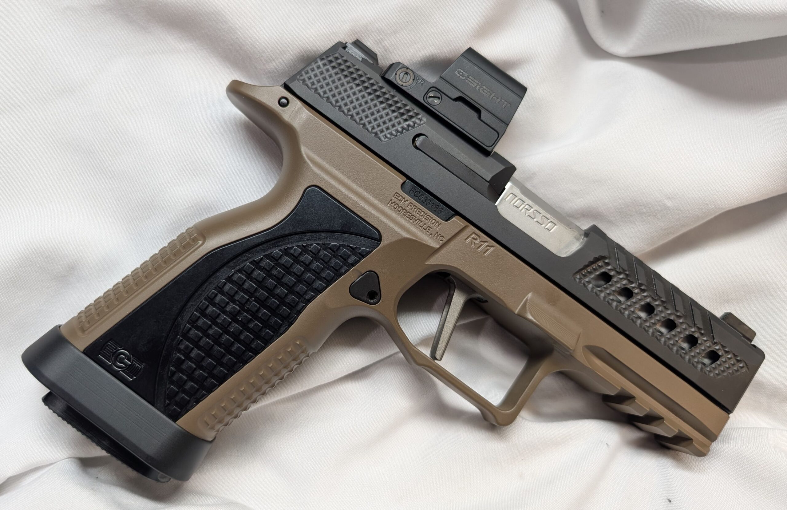 Featuring a Norsso 3.7 inch ported slide & Bull barrel, Angry Bear RSO Optic Height sights, ECM XMacro FDE R11 grip module, RAMM Tactical Silver Leverage Trigger Kit, OSight Optic, and (1) 17 round and (1) 21 round magazines brings a new level of performance to your EDC